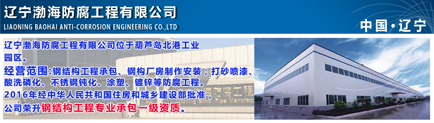 遼寧渤海防腐工程有限公司是一家集各種大型橋梁、鋼結(jié)構(gòu)工程制作、橋式、門(mén)式起重機(jī)制造、船體分段制作、礦山設(shè)備制造、環(huán)保設(shè)備研發(fā)制造、大型金屬涂塑、防腐處理等多元化機(jī)械裝備制造公司,2013-2016年公司連獲《國(guó)家高新技術(shù)企業(yè)》稱(chēng)號(hào)。 Liaoning Bohai Anti-corrosion Engineering Co., Ltd. is a collection of large-scale bridges, steel structure engineering, bridge, gantry crane manufacturing, hull segment production, mining equipment manufacturing, environmental equipment R & D and manufacturing, large metal coating, anti-corrosion treatment, etc. Chemical machinery equipment manufacturing company, the company won the title of "National High-tech Enterprise" in 2013-2016. 公司2017年榮升鋼結(jié)構(gòu)工程專(zhuān)業(yè)承包壹級(jí)資質(zhì),可承攬各類(lèi)大型鋼結(jié)構(gòu)及網(wǎng)架工程制作、加工、安裝;同時(shí)具有橋式起重機(jī)(C)制造、改造、安裝、維修資質(zhì);公司可承接各類(lèi)金屬表面防腐處理工程業(yè)務(wù)(酸洗、磷化、打砂、涂塑)。