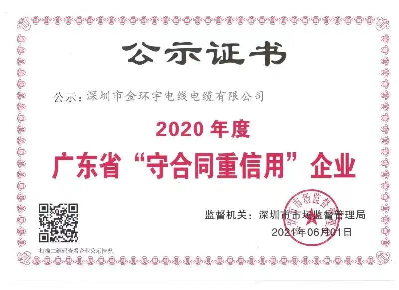 祝賀金環(huán)宇榮獲2020年度“廣東省守合同重信用企業(yè)”稱號